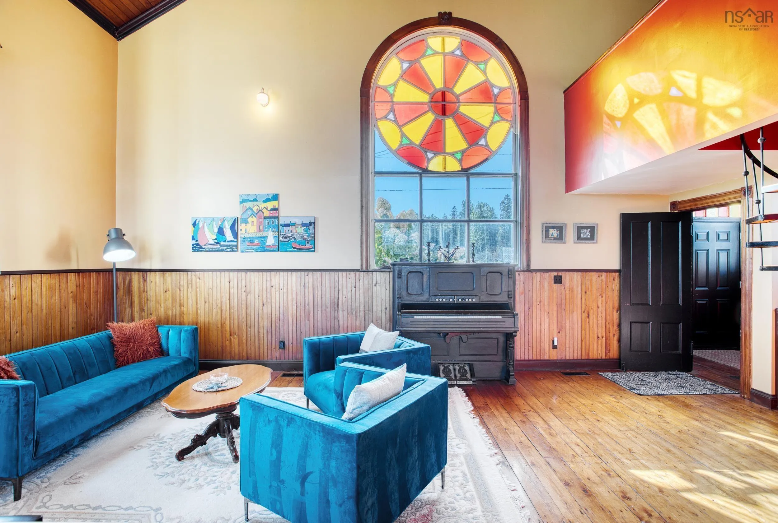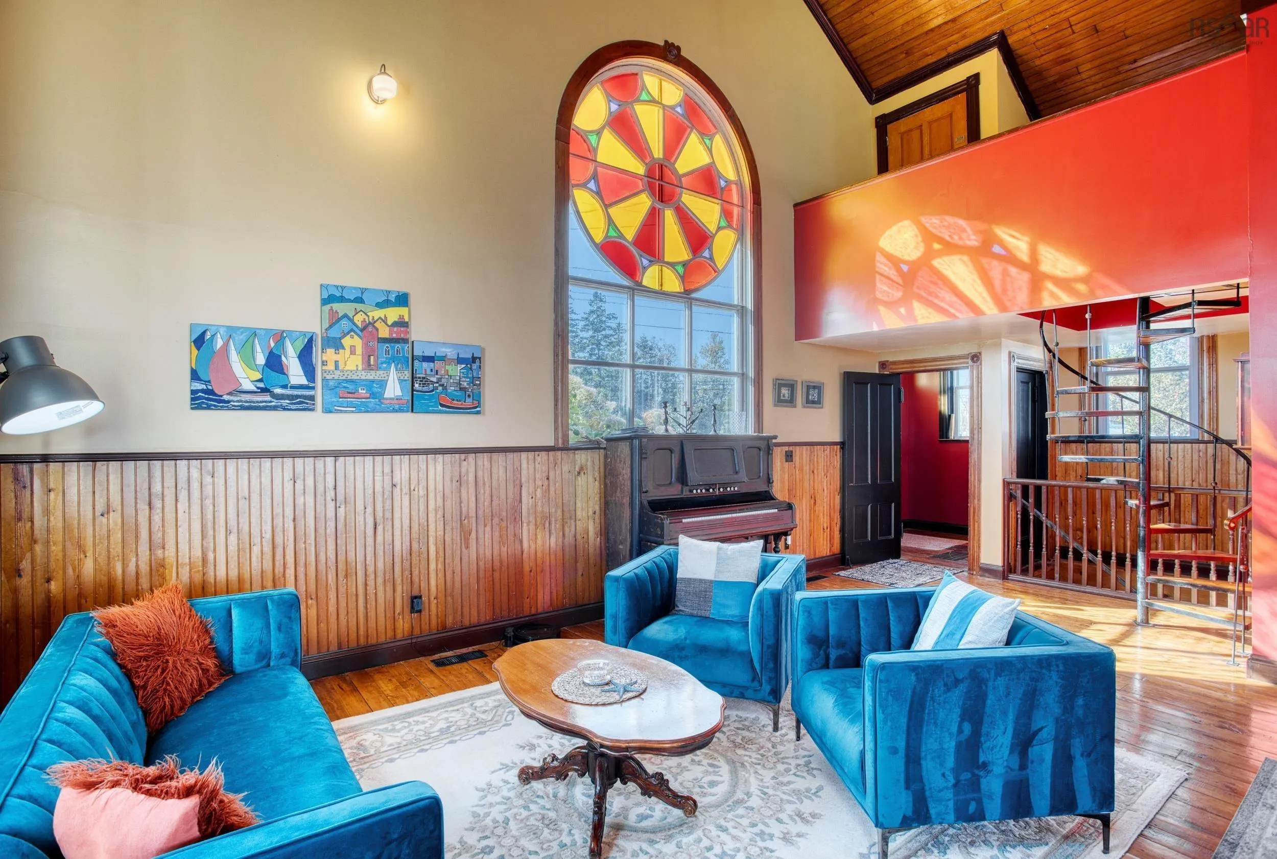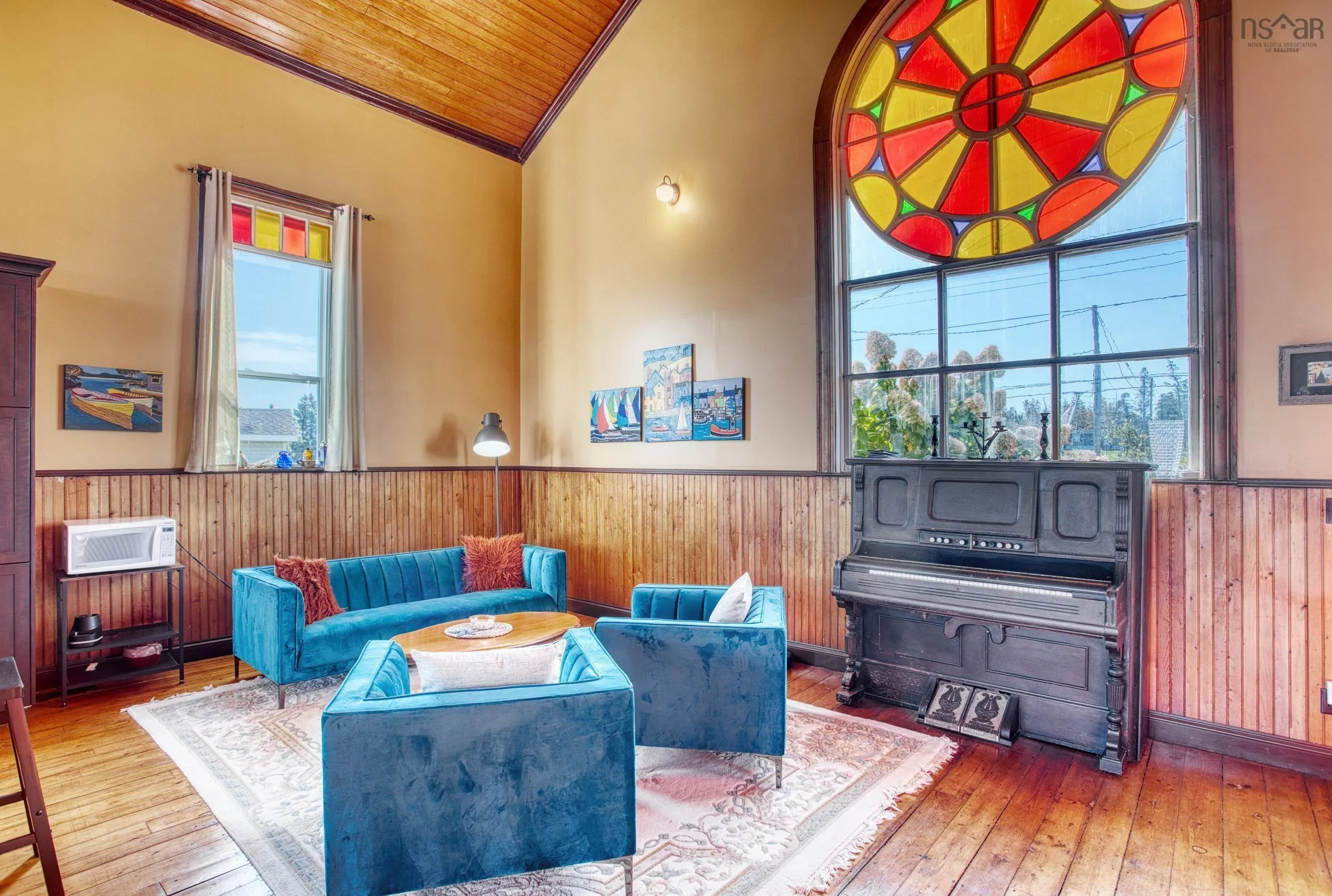 Discover a truly unique living experience in this magnificent church conversion that boasts breathtaking bay waterfront views. This one-of-a-kind property features a spacious two-bedroom layout with a charming bunk loft, perfect for family or guests. As you step inside, you’ll be welcomed into a large foyer and enter into an open-plan living area that seamlessly combines modern elegance with historic character. The main attraction is the impressive custom kitchen, complete with a massive island, ideal for entertaining and culinary adventures. Refinished softwood floors add warmth and charm to the space. The three-piece bathroom features a generously sized custom-tiled shower. The defined living areas are filled with natural light, thanks to the large stained glass windows at either end, that highlight the floor to the peak vaulted ceilings. The basement currently accommodates a combined laundry and storage area, a den or office, and a utility room. All areas are defined by stud partitions and the walls are spray foamed and ready for finishing. One of the highlights of this property is the tiered deck accessible via patio doors, where you can relax and enjoy the mesmerizing ocean bay views. Multiple parking spaces are available, making this property an excellent short-term rental opportunity. Conveniently located near Fox Harbour golf course and the ski slopes of Wentworth, this church conversion is a slice of paradise for those seeking a unique blend of history, luxury, and coastal living. Don’t miss the chance to make this exceptional property your own and wake up to the beauty of the bay every day.